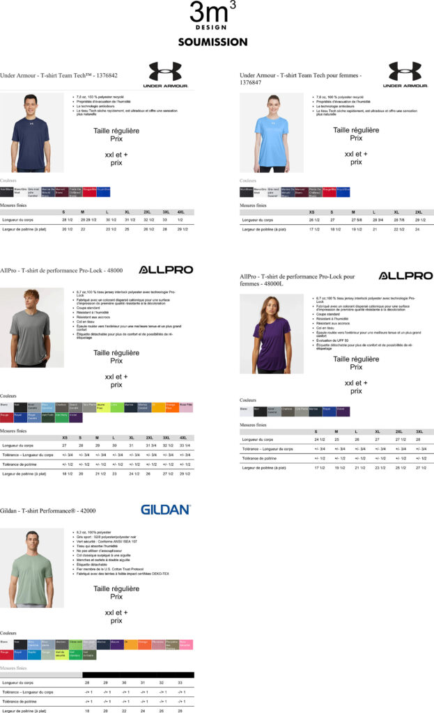 PROPOSITIONS DE STYLES ET DE VÊTEMENTS EN FONCTION DE VOS BESOINS. (IDENTIFICATION - EMPLOYÉ - POUR LA REVENTE - PROMOTIONNEL - ÉVÉNEMENT - ETC.. AUSSI NOUS POUVONS VOUS AIDER AVEC VOS VISUELS (LA RÉVISION ET/OU CORRECTION) POUR OBTENIR UN MEILLEUR RÉSULTAT